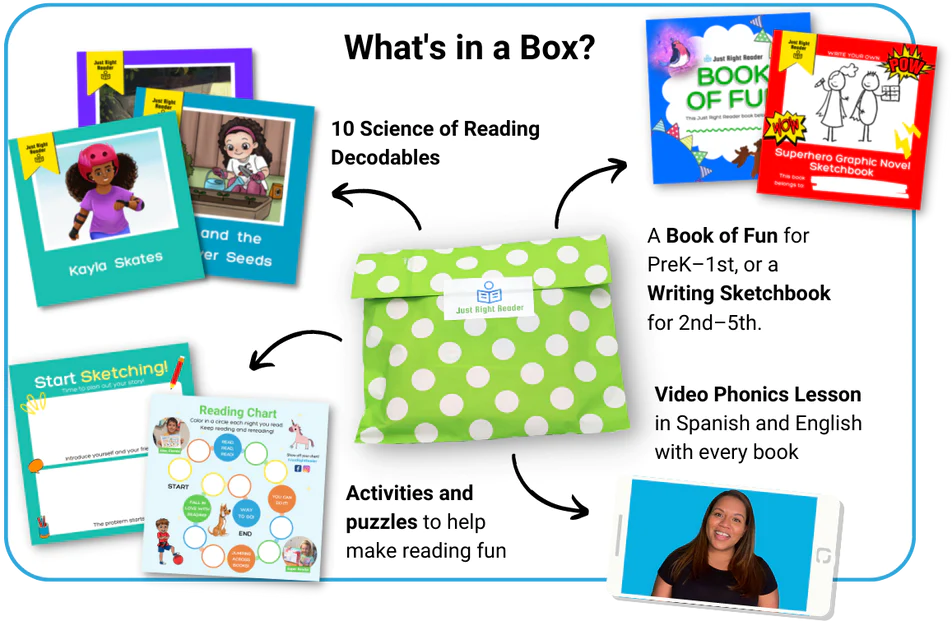 Just Right Reader even sells Take-Home Decodable Boxes: students get personalized-to-their-phonics-level packs of decodables to take home and keep. Parents can use the QR code on the back of each book to access the phonics lessons and reinforce what’s being taught in the classroom!