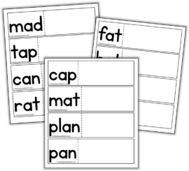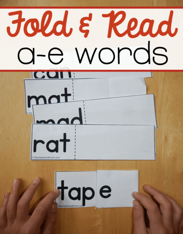 So I came up with these. I call them “fold and read” cards. When you cut out the strips, you can fold in from the right side to change a short a word to an a-e one.