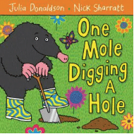 We like the bright pictures and gardening rhymes in this simple counting book. “One mole, digging a hole, two snakes with garden rakes, three bears picking pears…”