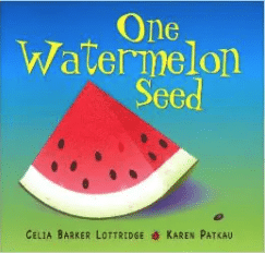 This is a simple counting book with colorful illustrations. A brother and sister plant a garden: one watermelon seed, two pumpkin seeds, three eggplants, etc. The book shows us how they care for the garden and get a big harvest. I like that it includes counting by 10’s to 100, too.