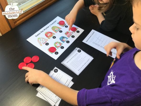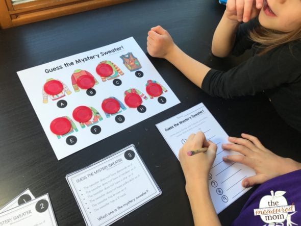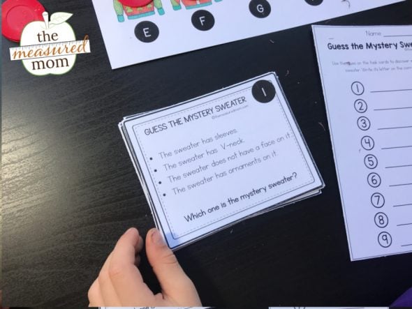 I created a set of task cards. Each card has a set of clues to help kids determine the mystery sweater.