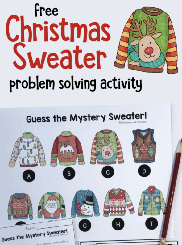 My six and five adored this! They were a little confused about number 9, though. They counted the berries as a set of three (sweater B) and therefore crossed off all the sweaters! Great resource for them to practice on these “it’s almost Christmas!” days!