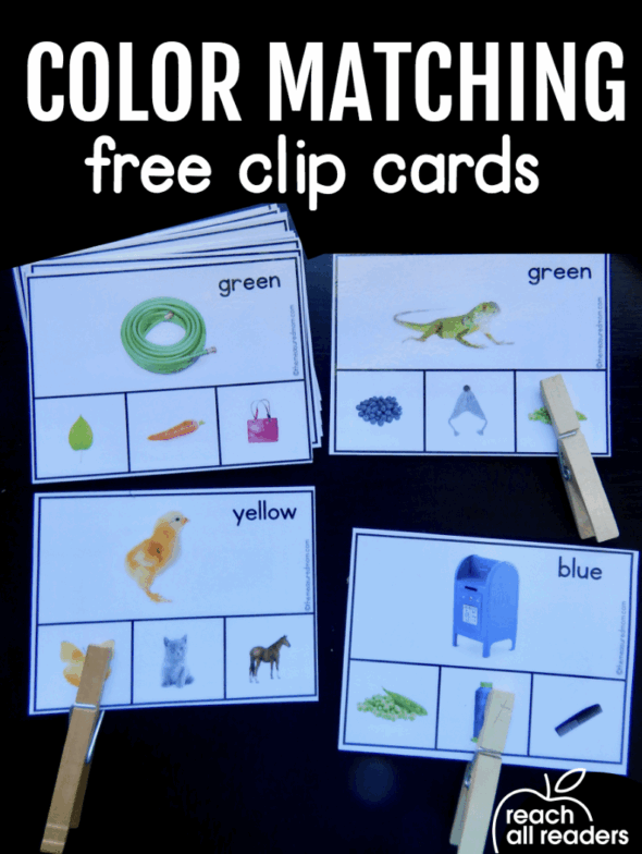How is your toddler or preschooler doing at learning those colors? Sometimes it helps to try a matching game. I created these simple clip cards to give your preschooler the opportunity to match colors and get some fine motor practice in at the same time.