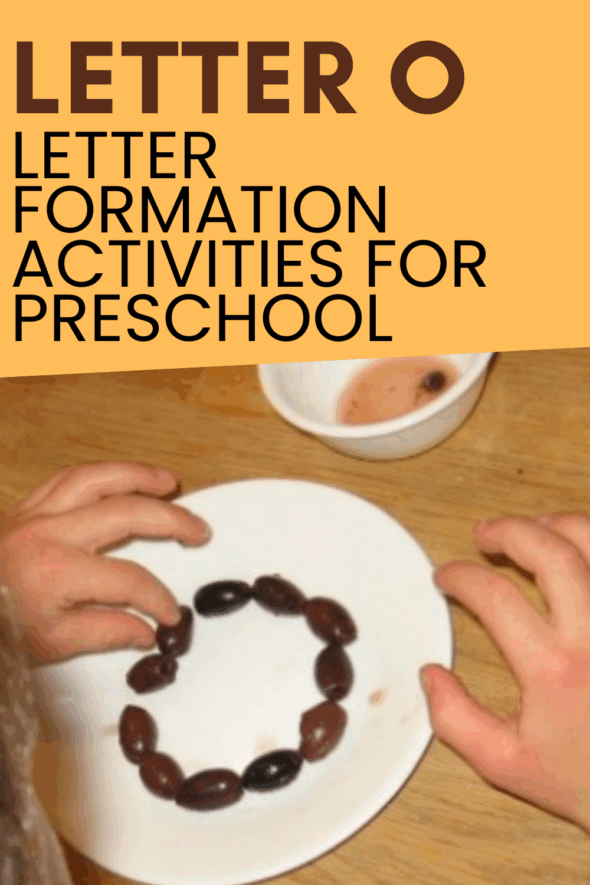 I remembered that we had a small olive jar left in the fridge, so my Five made the letter O with olives. You could also use oranges, but they were most definitely not in season when we did the letter O, and I couldn’t see paying big bucks for a bag of summer oranges just for this post!
