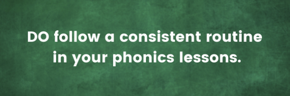 DO follow a consistent routine in your phonics lessons. When kids have a routine for the easy stuff (knowing what comes next, getting out their letter tiles, etc.) they free up their brains for the more challenging work. A routine also keeps the teacher on task and makes planning easier!