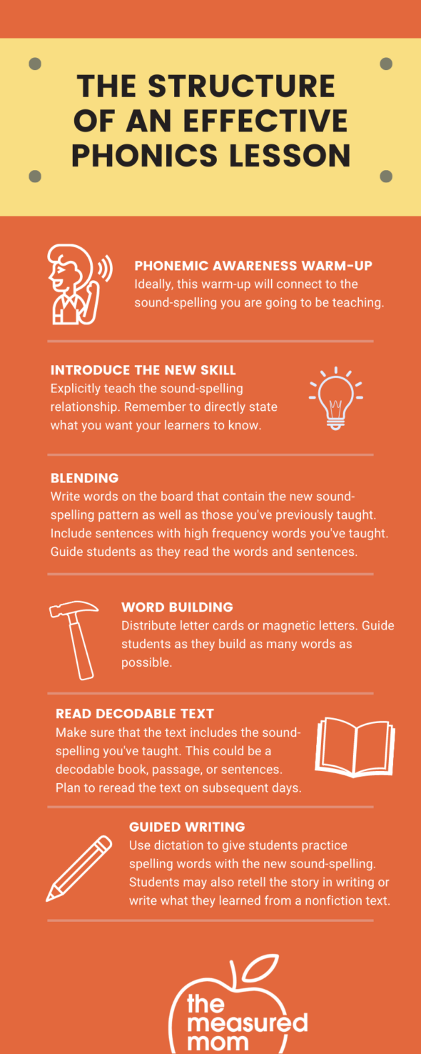 - Within your groups, follow the structure of an effective phonics lesson, as noted in the above infographic. Your lower groups will likely need longer lessons than your highest group.