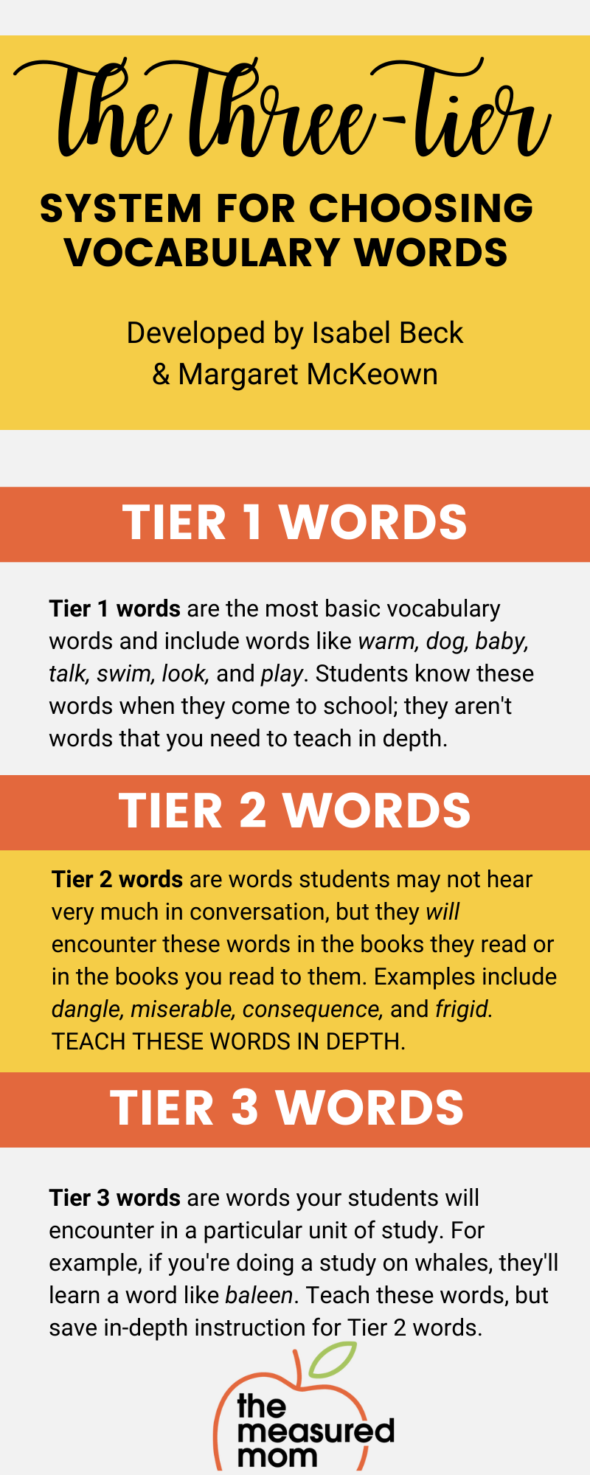 Instead, I recommend following Isabel Beck and Margaret McKeown’s system for selecting the words in a text best suited for direct vocabulary instruction.