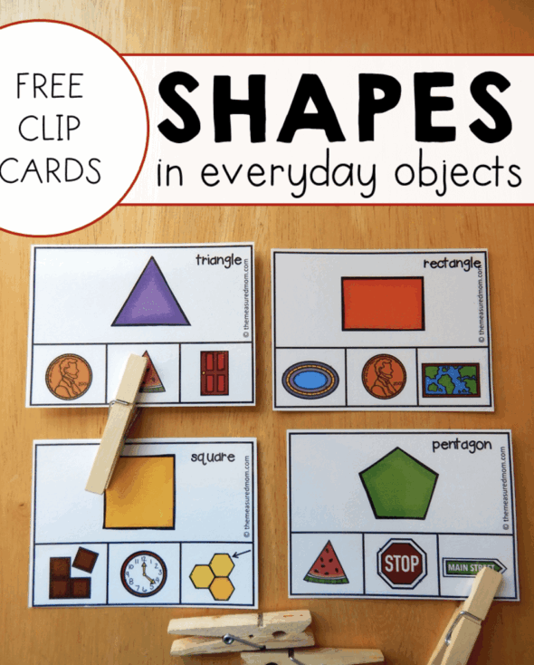 I had a feeling that he’d change his tune, however, so I insisted. He can identify basic shapes quite well, so I created these clip cards to help him find shapes in everyday objects. Before I pulled out the first card, I called his attention to shapes in our kitchen.
