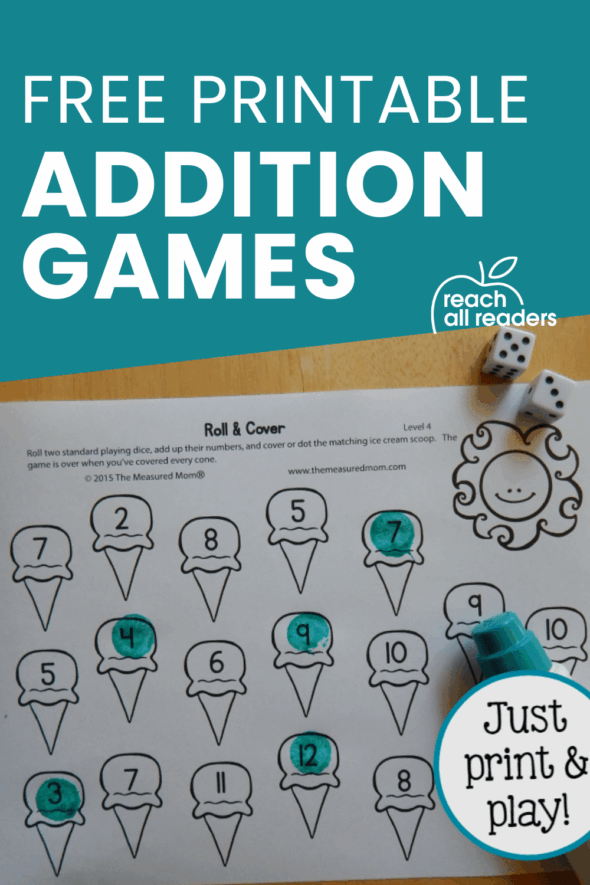 This week I’m sharing five Roll & Cover games to help your child practice addition. Are you familiar with Roll & Cover games? Just roll the dice, add the numbers, and cover or dot the answer on the board. When all the numbers are covered, the game is over.