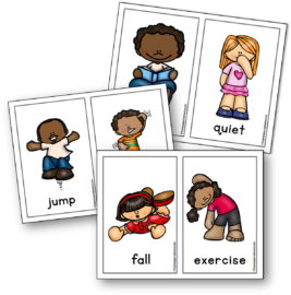 - After you’ve been doing the cards a while, see if your child can remember the action word before turning the two-sided card over.