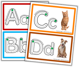It’s a collection of cards with an uppercase letter, lowercase letter, and picture cue on each one. Each letter has a green dot to show the child where to begin tracing.