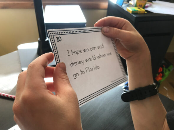 We took turns drawing a card, reading the sentence aloud, and finding the missing capital letter(s).