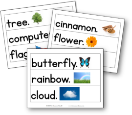 He was able to find the words “I” and “can” without any trouble. He knows the letter I, of course (thanks and could find “can” by the sound /k/. I helped him find the other words. He chose which picture card to put at the end of each sentence.