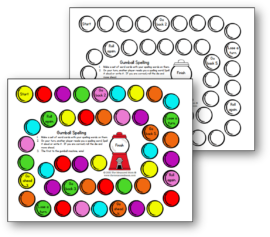 This game is based on one of my earliest printables. Spell it! is another gumball themed spelling game, but it takes two full pieces of paper to make the game. The longer I blog (and teach my own kids), the more I realize that we all need something simple. Assembling a two-part game and laminating it may not be what we have in mind.