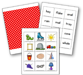 This game for reviewing long a patterns (ay, ai, and a-e) is a memory game – sometimes called Concentration.