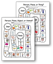I love this game board and I am looking forward to the other game boards. I am using this game board with my kindergarten children most of whom are learning to speak English. I made two game boards – the first we use as the game boards – the second one I cut up so that the first person who lands on a square can take the cut up piece and classify it according to whether the noun named a person, place, object, or animal. My children love it and love playing the game. It is really motivating and helps them learn the English names for many things. ( I now that you are really busy – but I could see where two or three different game boards with different nouns would be really helpful.)