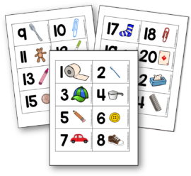 I created a set of number cards. Each card has a picture of an object we can easily find in our house.