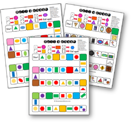 Take turns rolling the die. After you roll, look at the key at the top of the page and move to the closest corresponding shape. For example, in this game you move to a square when you roll a 2. You might move to the cracker, quilt, chocolate bar, window, checkerboard, or cheese – depending on which is closest.