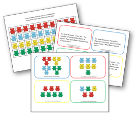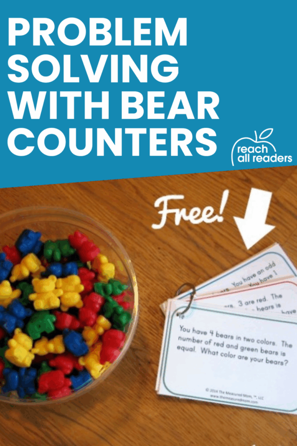 I used our red, blue, green, and yellow counting bears for this problem solving activity, but you could use any manipulative in those colors. Even scraps of colored construction paper would work! You can also use the printable paper bears in the free download at the end of this post.