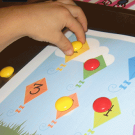 For each mat, he read the number and counted the clear plastic counters as he placed them on the gray dots. This was great practice in one-to-one correspondence!