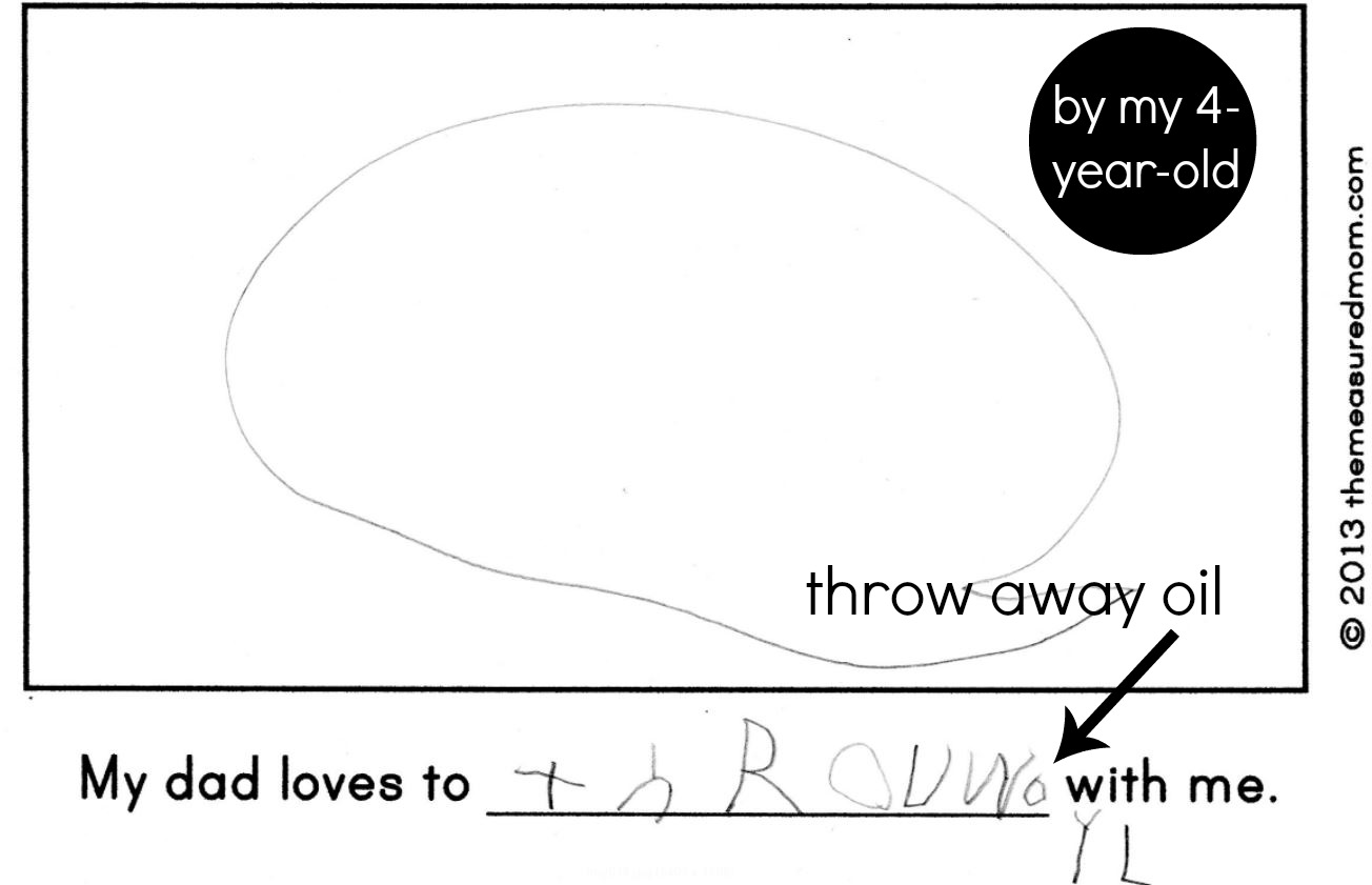 One thing I enjoy doing with my kids is having them make personalized books as gifts. So a few years ago I made a template that each of them could complete – according to their own ability. Each year I republish the post during the week of Father’s Day. So if you’re a regular follower of my blog, know that we’re going back in time a bit for these ages. 😉