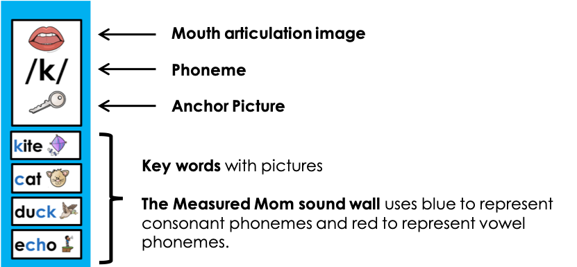 Sound walls usually include pictures to represent what the mouth looks like when making each sound. An anchor picture is included with the mouth card.