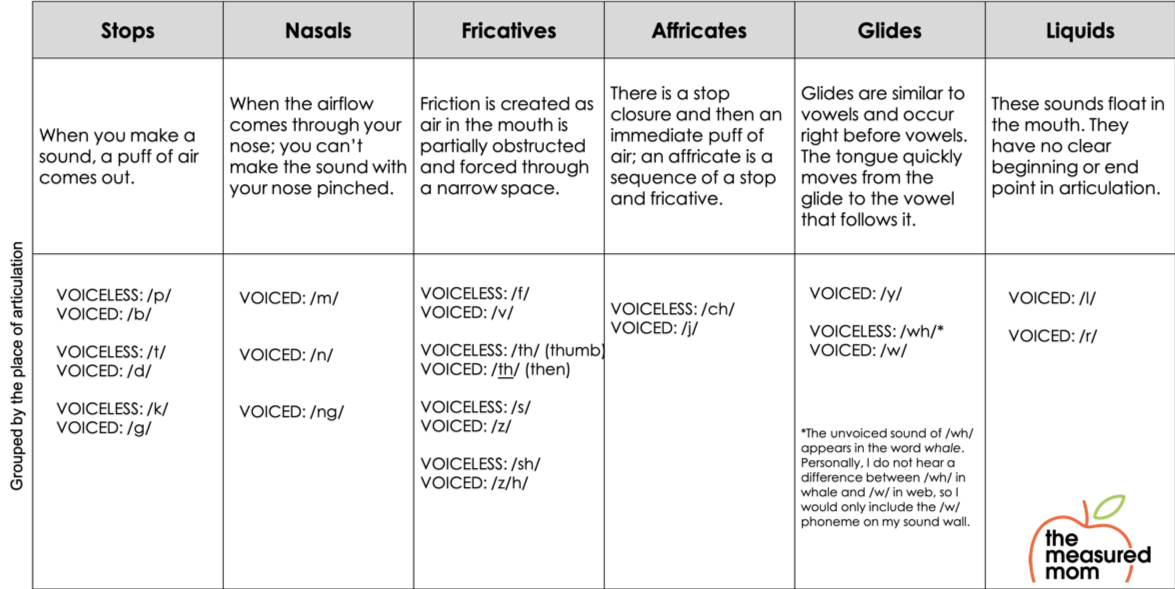 Sound walls organize the consonant phonemes into 6 categories: stops, affricates, nasals, fricatives, glides, and liquids. Each category contains both voiced and unvoiced sounds. A voiced sound is made from the voice box. Put your hand on your throat when you say a sound to feel if it is voiced (you will feel a vibration in your throat) or unvoiced.