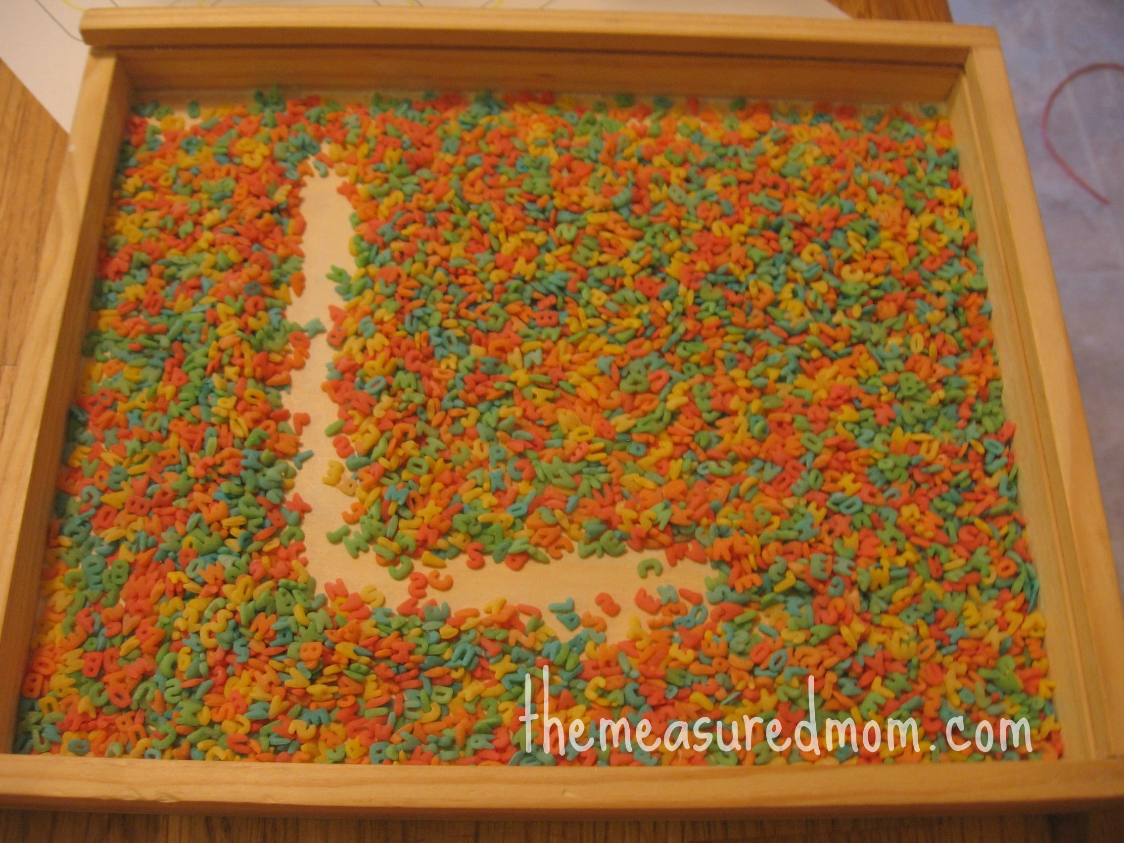 I poured some colored alphabet pasta (read about our “L is for letters” sensory bin here) into a tray, and the boys wrote an “L” with their fingers.