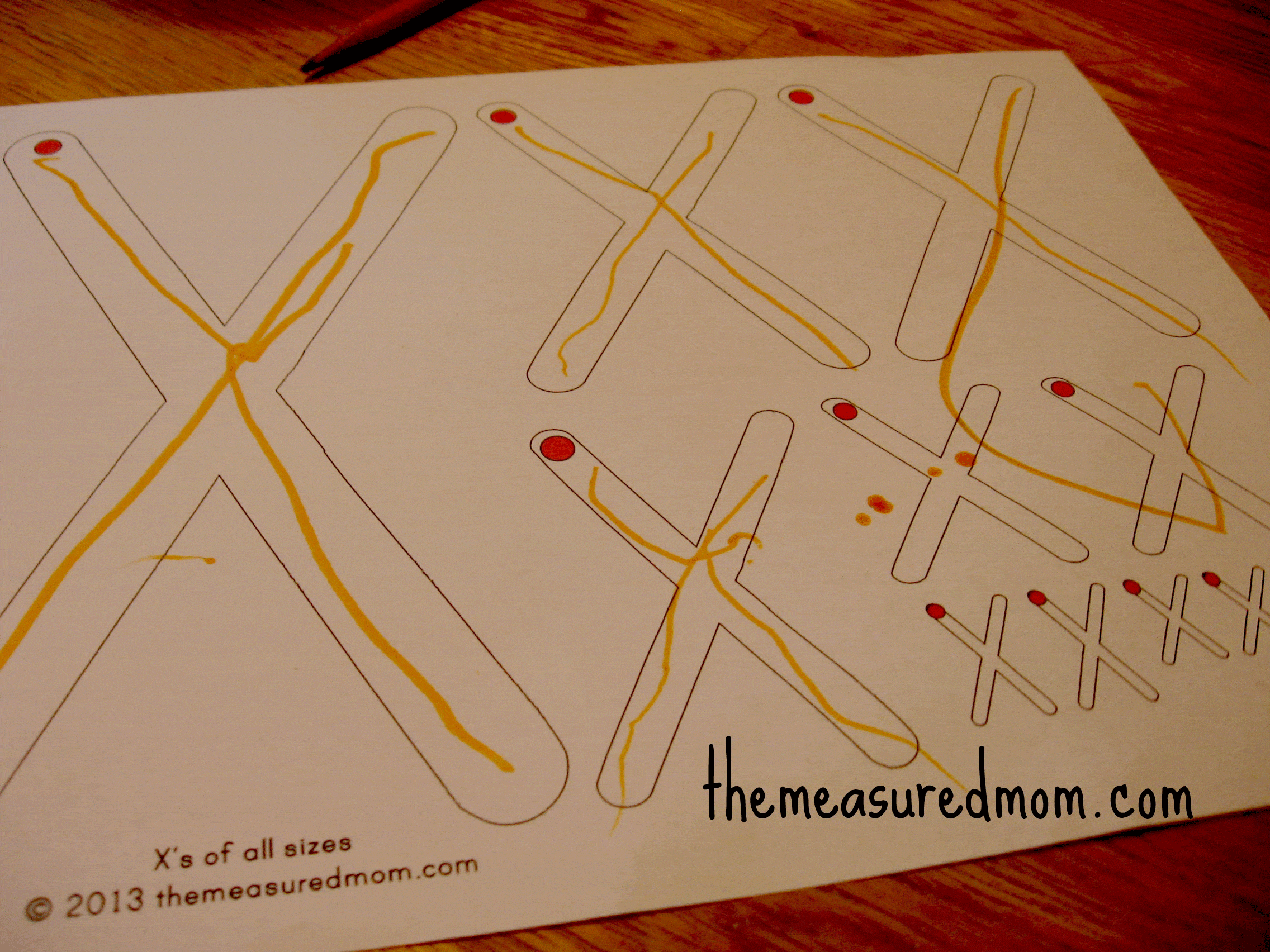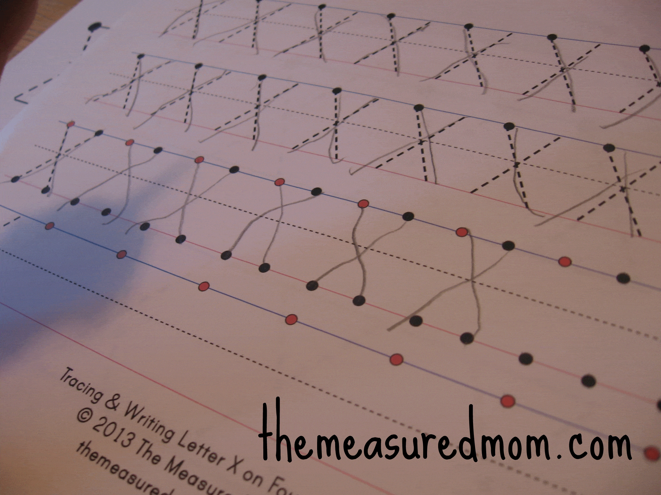 My Four started with this page: tracing X’s on two lines. Want your copy? Get it here.