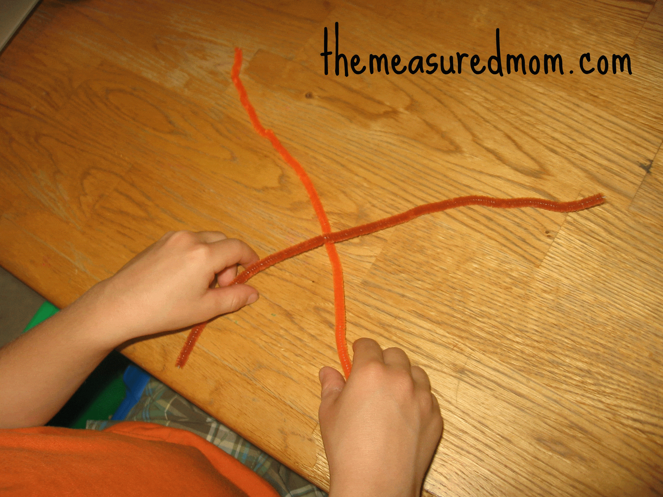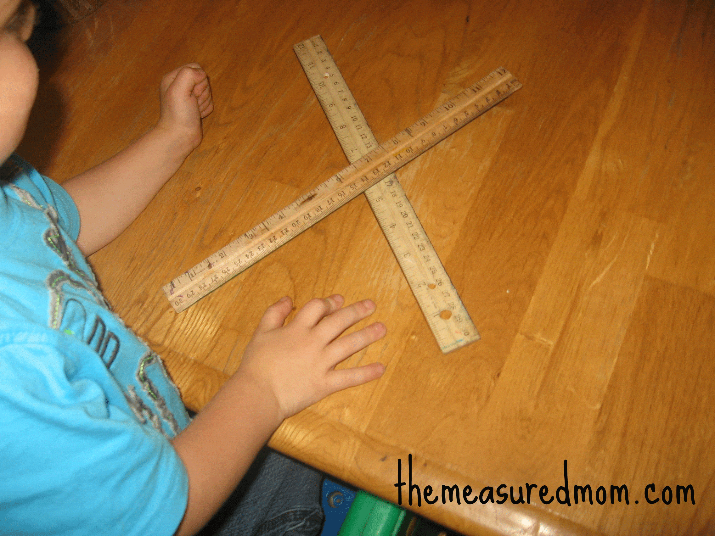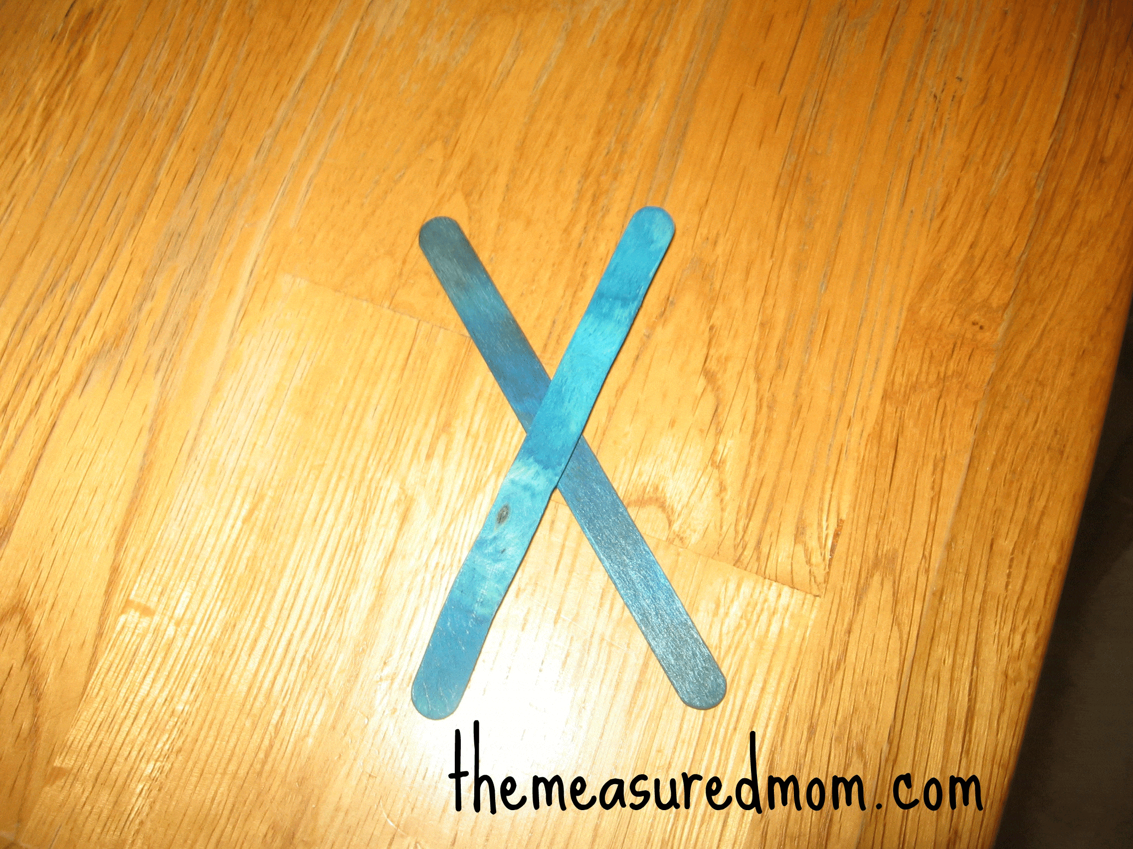 The letter X is a simple letter to make with manipulatives because you just need two straight pieces. My just-turned-Three made an X in a number of different ways: