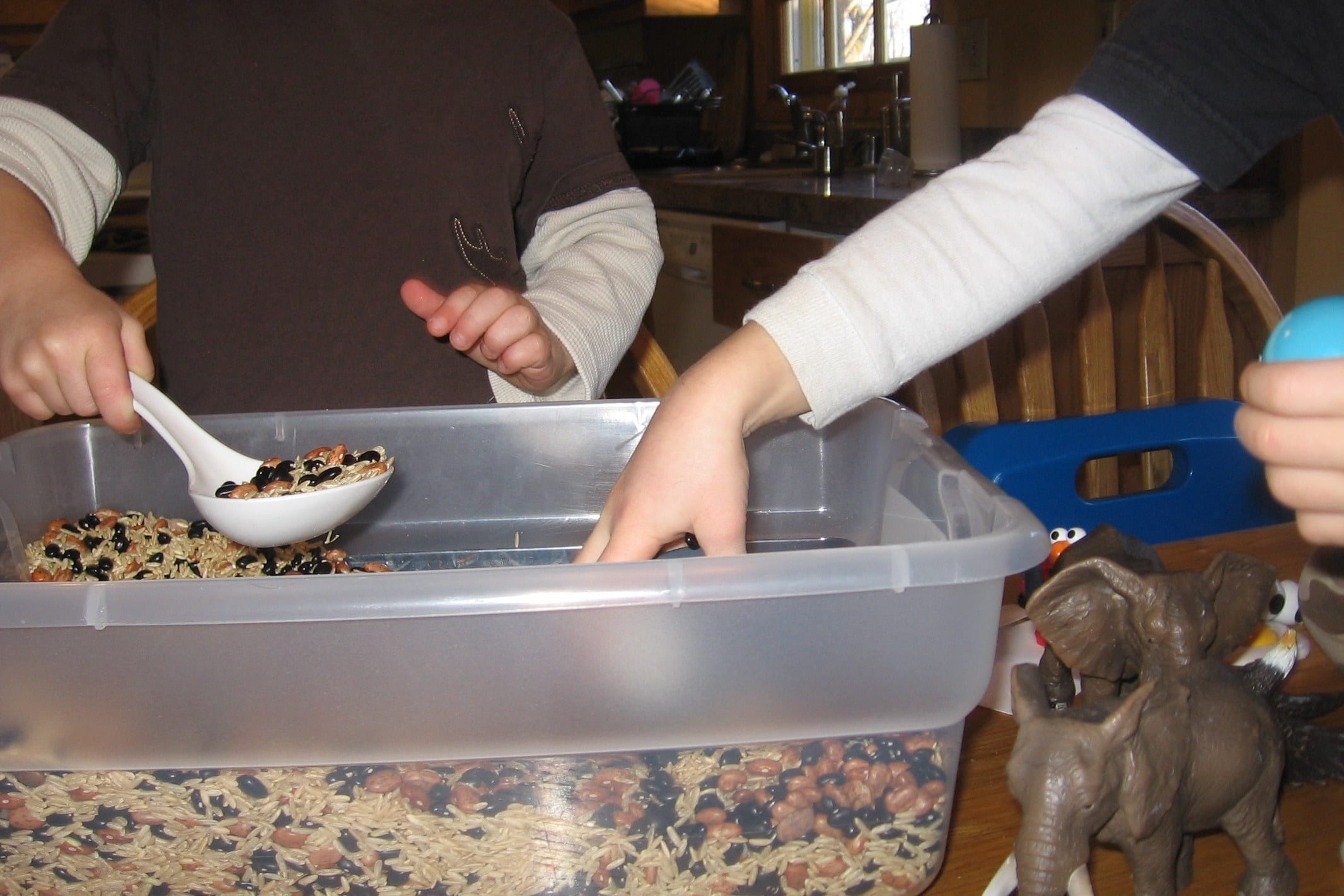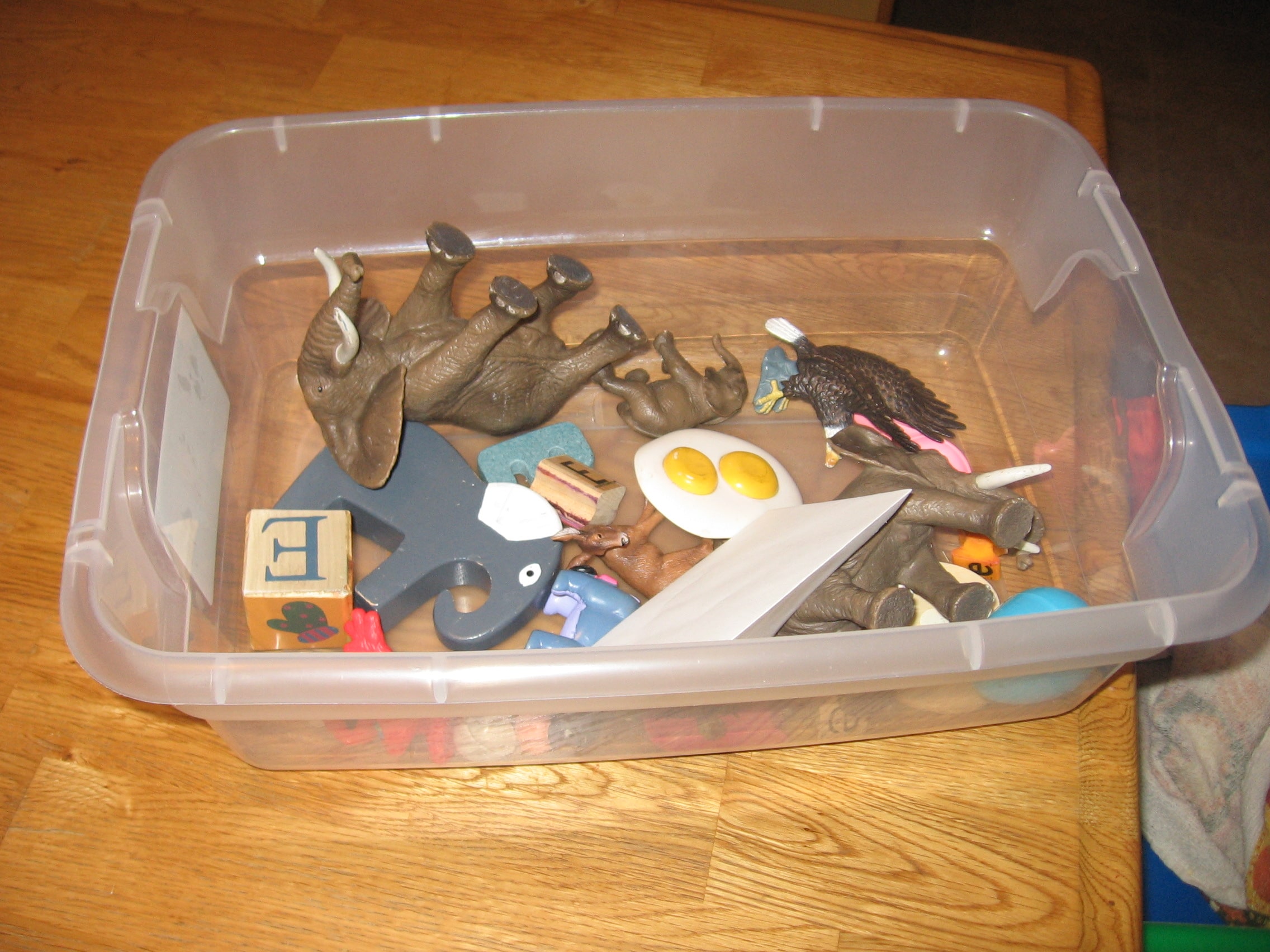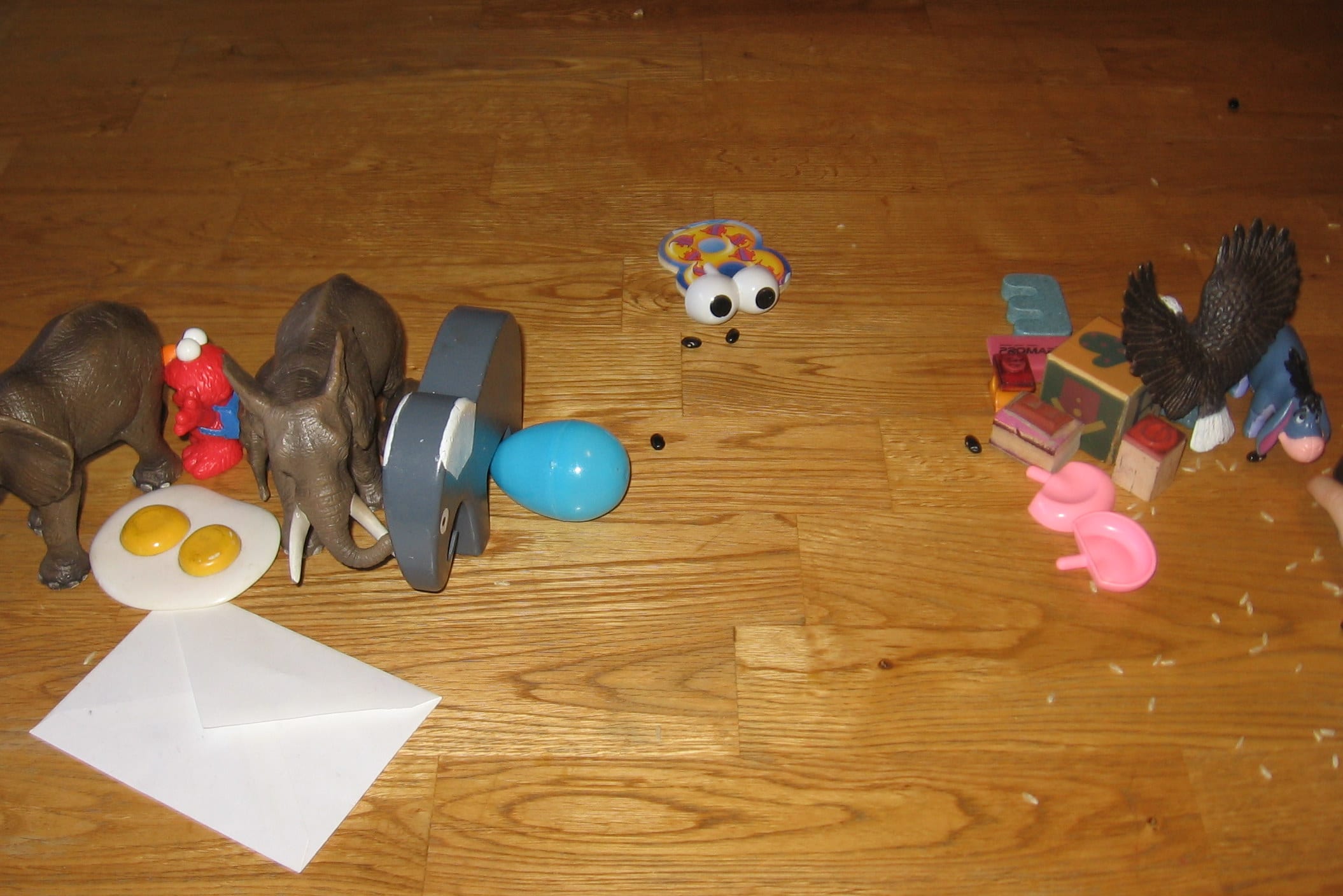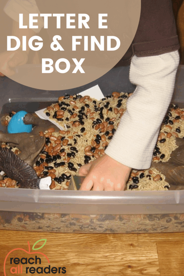 I need more E toys! I don’t think we have most of these things (as toys). Did you keep the rice and beans for another activity?