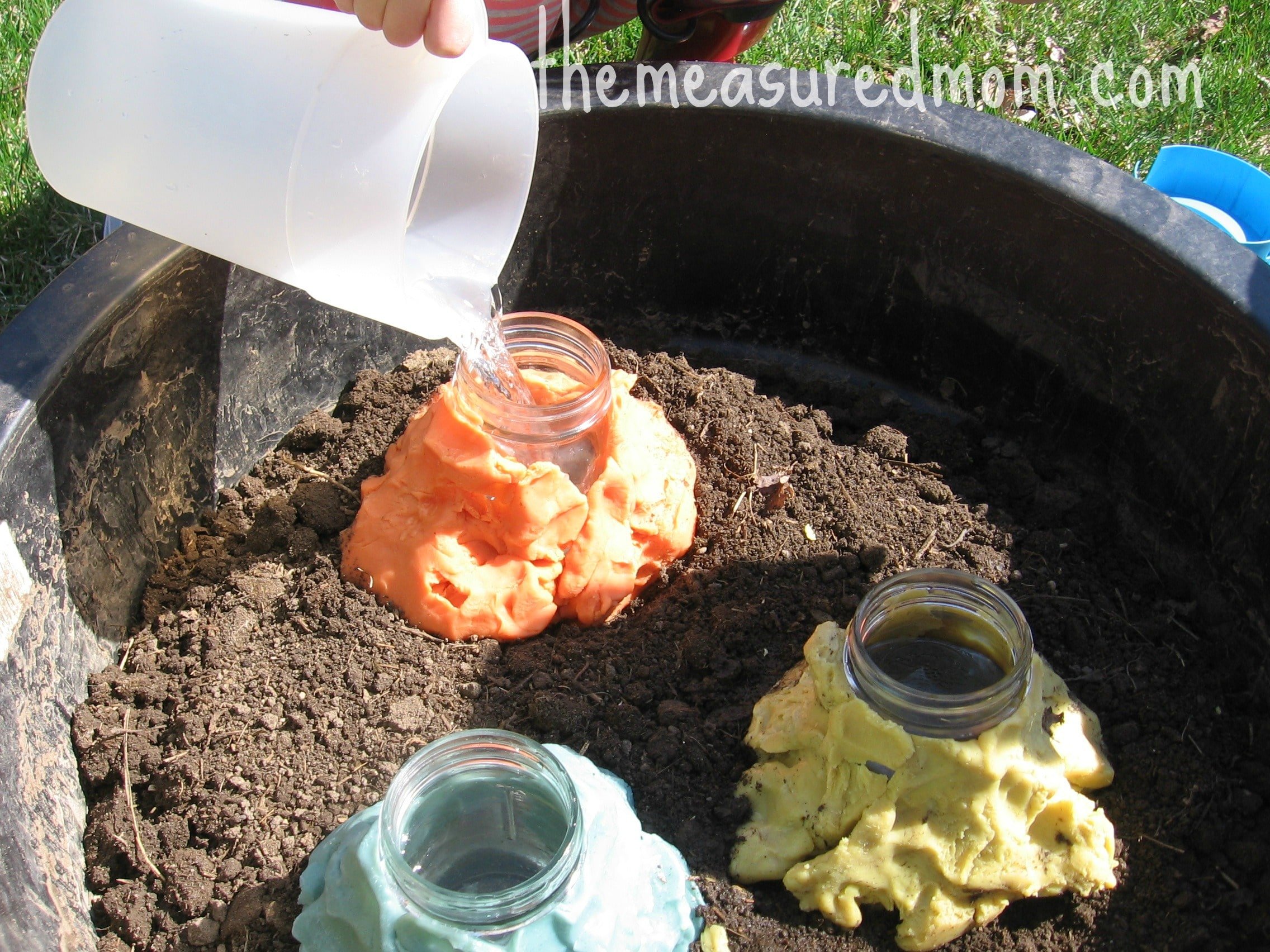 1. Use the playdough to form a volcano around the mason jars. I thought my kids would like this part, but they had a hard time getting the play dough to take the shape of a volcano. I helped.