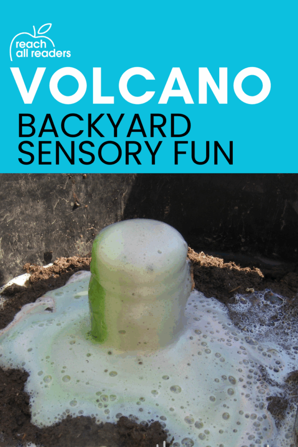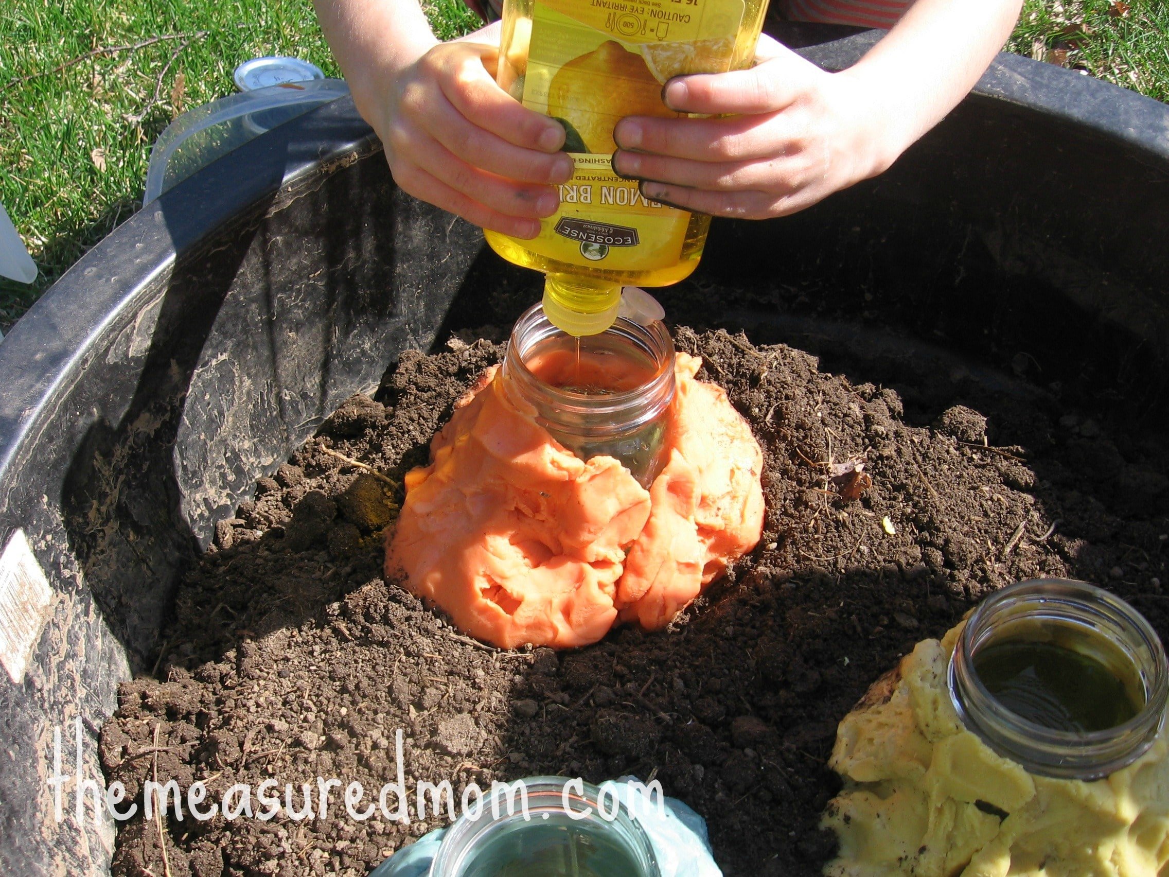 We’re working our way through the alphabet, and we include a sensory bin idea for each letter. This week we took advantage of the (finally!) beautiful spring weather and made a volcanic sensory bin outdoors. Do you know how to make your own volcano? It’s a fairly common science activity — but throw in some mud and it’s extra fun.