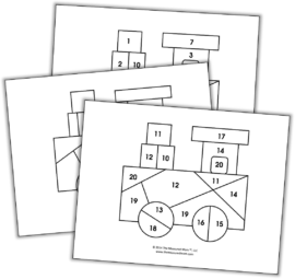 1) On the cards, draw a certain number of dots. Have your child count the dots and color the matching number on the train.