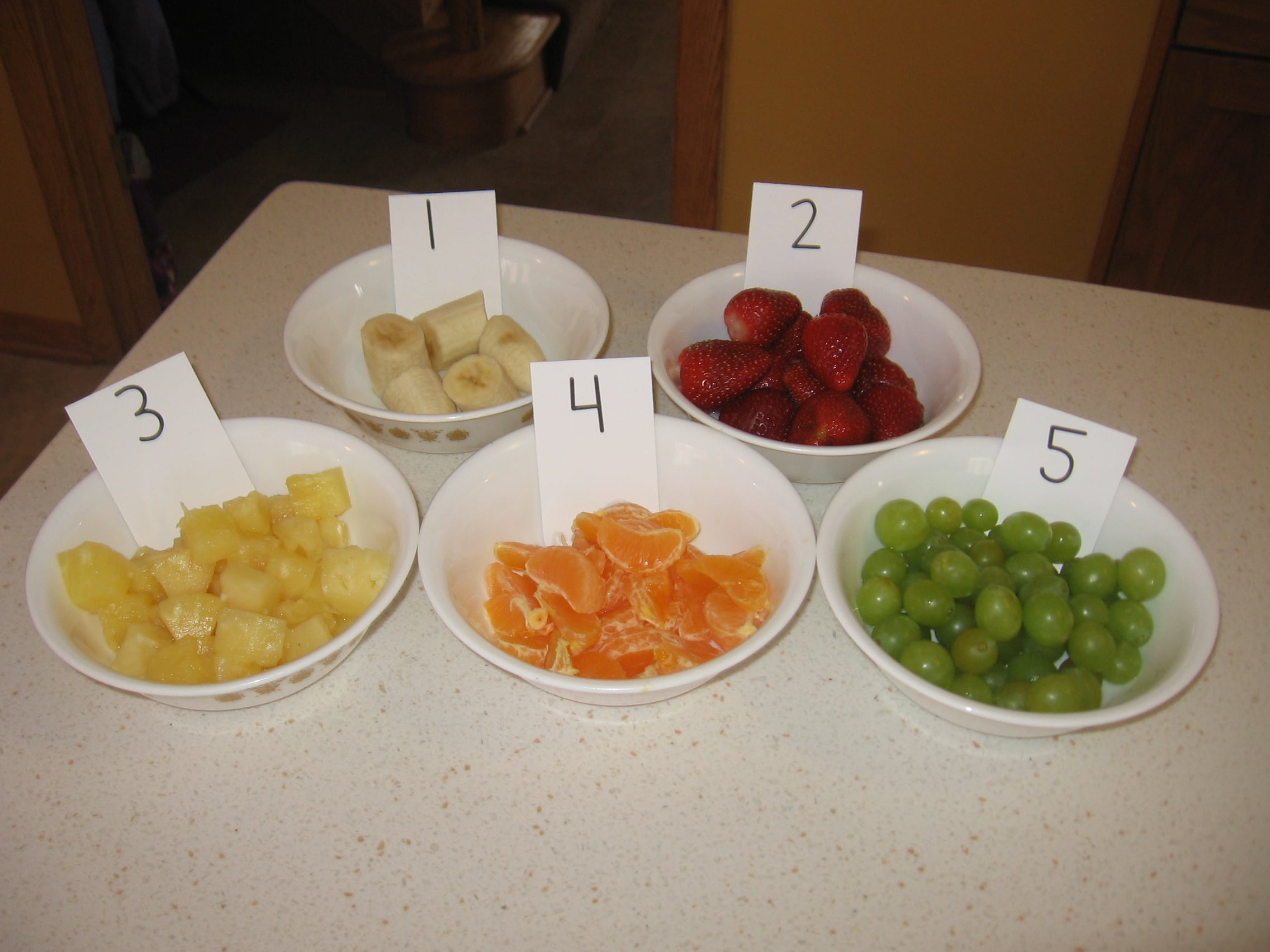 After church we ran to the store (in 16°! Ack!) to get some strawberries and grapes so we’d have enough fruit to work with. Then I put fruit pieces in each of five bowls: