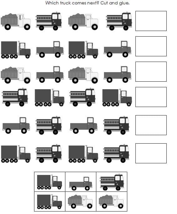 The last part of my pack is these two worksheets which could be used at home or in a classroom. I prepared them in grayscale for printing and photocopying. The level 1 worksheet is ABAB patterns. My Four had no trouble finishing the patterns, but he needed help cutting out the trucks at the bottom of the page.