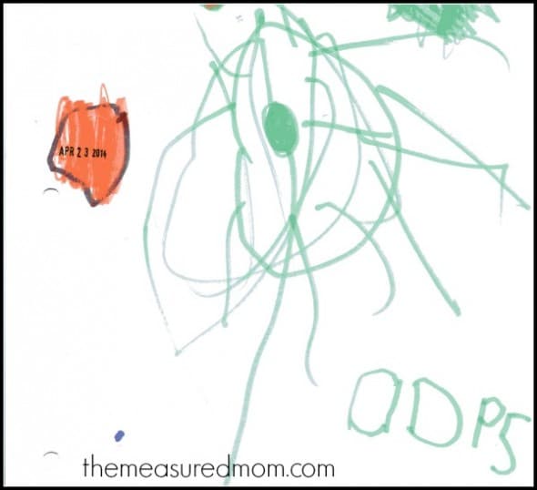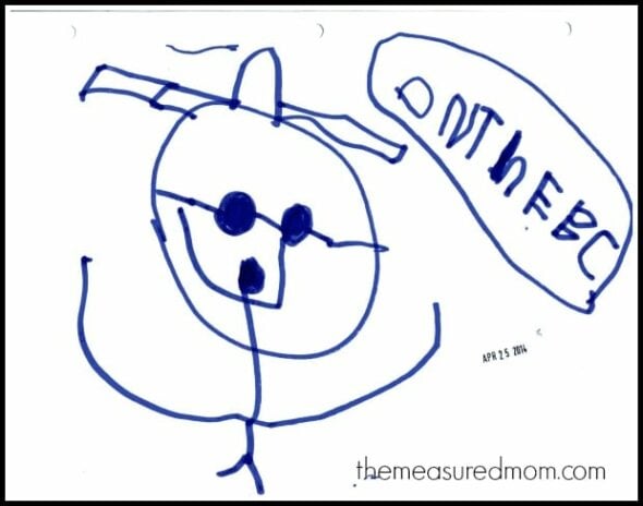 The above octopus, spelled “ODPS,” was drawn by my now thirteen-year-old when he was almost four years old.