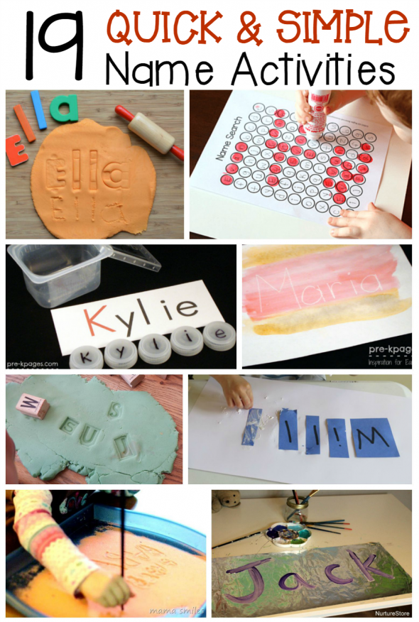 Before you have your child practice name writing with a pencil, you’ll want to do a lot of hands-on activities to help him recognize and form the letters of his name. You’ll find some quick name activities in this post and even more of our favorite name activities here.