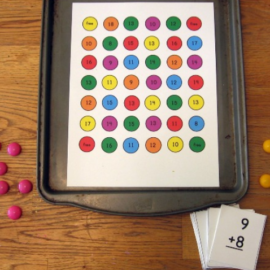 3. Give your child a stack of flip cards and 10 counters. You may want to start with just the simpler cards — those whose sums are 5 and under, for example. My just-turned-Five loves math, so I took a chance and gave him the whole stack with the expectation that we would work until he tired of them. For counters, I brought out our colorful power magnets and a magnetic baking sheet – because they always add to the fun.