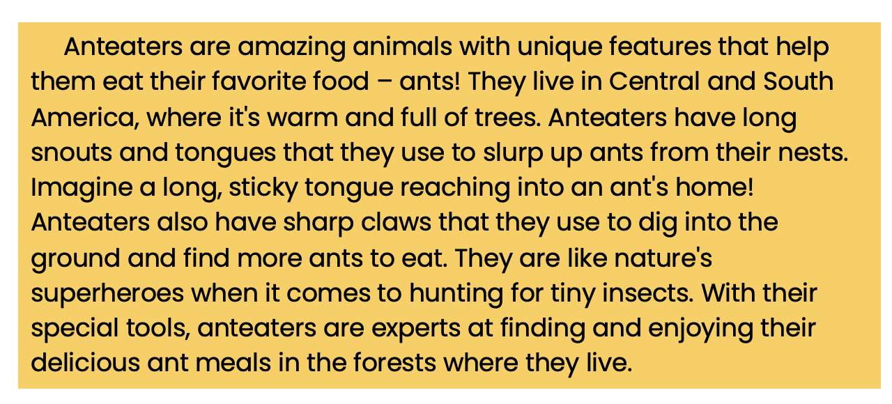 “Write a paragraph for third graders using the description text structure to describe anteaters.”