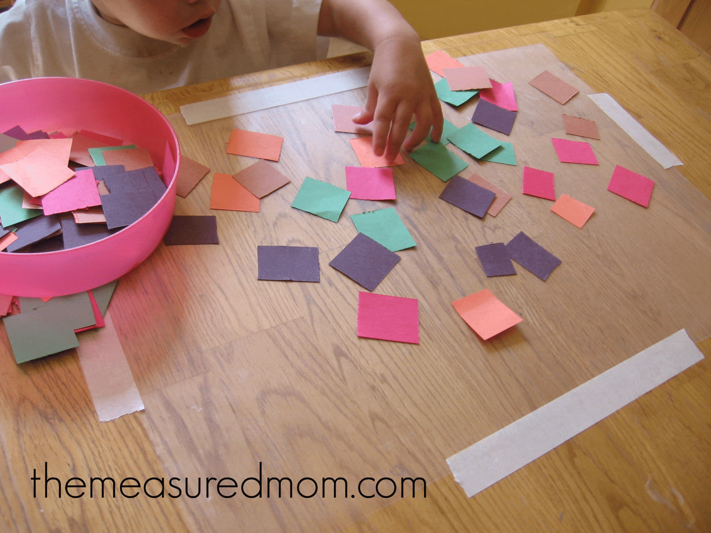 I love clear contact paper. If you peel off the backing and tape it to your table with masking tape (sticky side up), you provide a fun work surface for your toddler. Give him a pile of construction paper squares and show him how to stick them to the paper. After about ten minutes of patiently sticking the squares to the contact paper, my toddler took them all off again and put them back into the bowl. A great first craft that he can do all by himself!