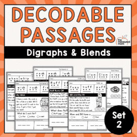 Use these 46 decodable passages to help new readers develop fluency with words with digraphs and consonant blends. Each page includes blending practice, a short reading passage, a comprehension question, and spelling practice.
