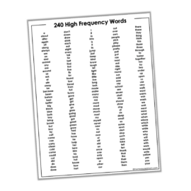 I’ve created a list of 240 words that includes the Dolch 220, Fry’s first 100, and a few others.